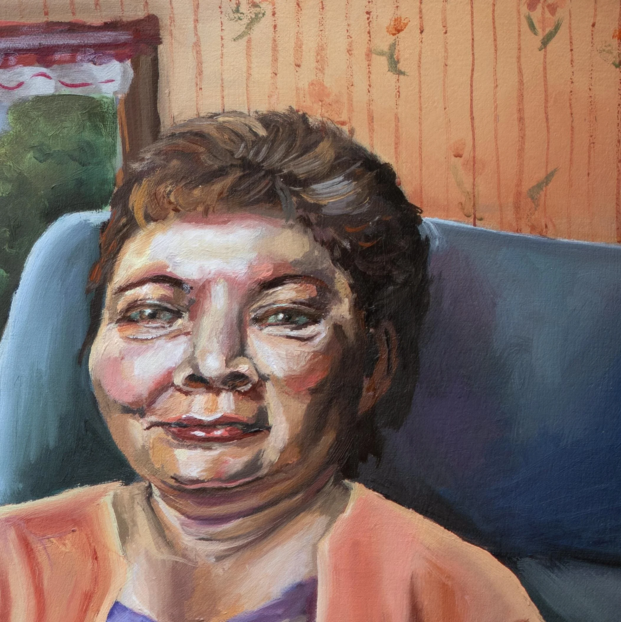 An original oil on canvas painting by Jennifer Heron. This piece of contemporary art depicts a young child giving a bouquet of freshly picked dandelions to her grandmother, who is reading the old school TV guide
